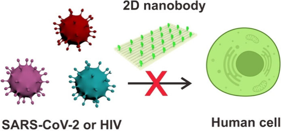 Schematic illustration of a versatile two-dimensional nanoarchitecture with spatially patterned Nbs for protecting human host cells from viral pathogen infections. Image courtesy of Xing Wang.