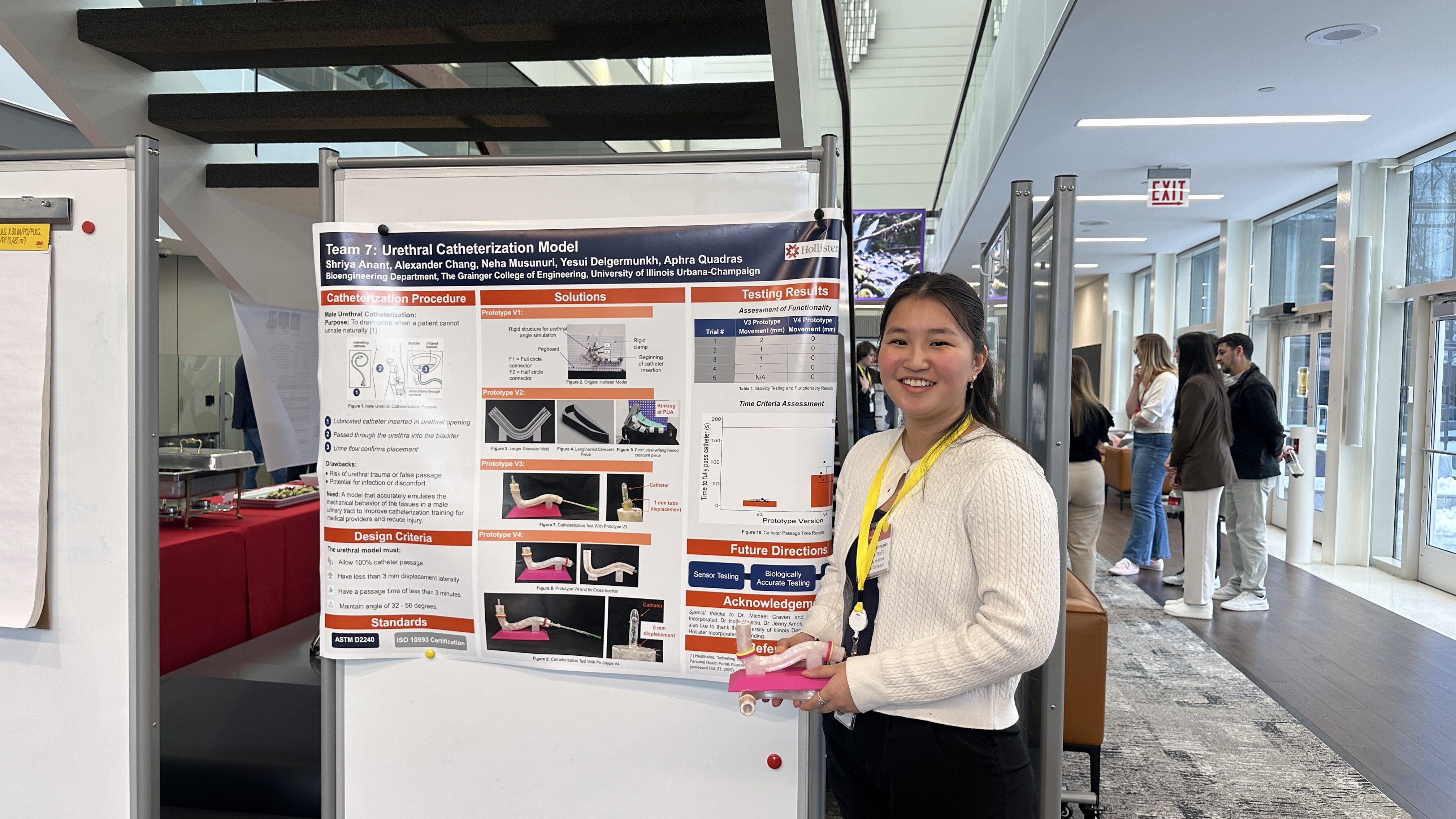 This unique experience allowed students to practice their presentation skills in a more formal, industry-like setting. “Presenting at the Hollister Capstone Ecosystem Conference was a very different experience from a classroom presentation,” said Delgermunkh. “Speaking with industry professionals helped me better understand the real-world impact of our design, not just for Hollister, but ultimately for clinicians and patients who rely on safer catheterization methods.”