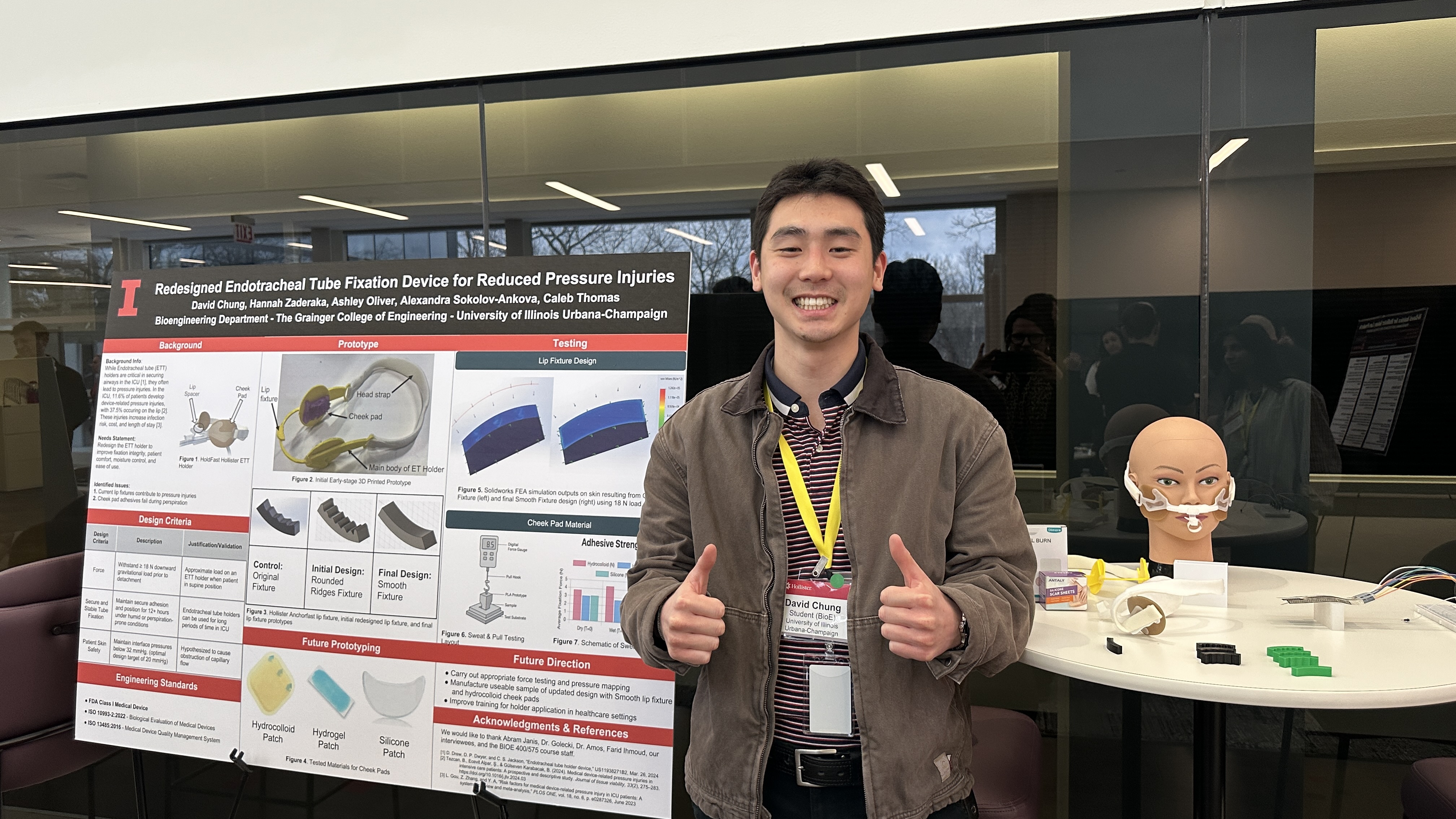 Chung’s project focuses on ventilator safety, continuing the university’s proud tradition of innovation in respiratory care. When the central tube of the ventilator is not held in the proper position, these devices can damage the patient’s face over time. Chung and his group are redesigning endotracheal tube holders to better distribute pressure and minimize the damage.